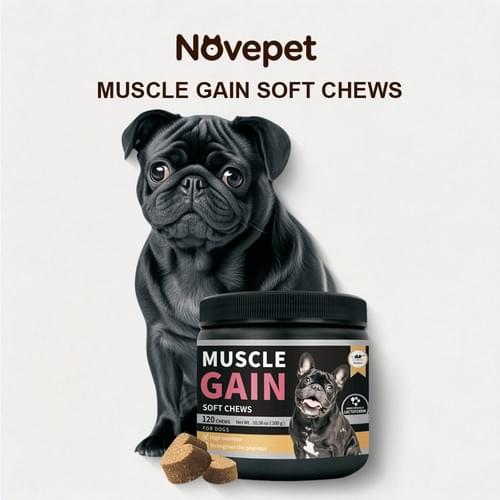 Muscle gain soft chews for dogs: formulated to promote muscle protein synthesis for increased muscle mass, accelerate energy metabolism to boost exercise endurance, repair muscle damage and reduce exercise fatigue, plus optimize nutrient absorption to maximize muscle gain efficiency — ideal for working dogs, canine athletes, or pets recovering from muscle loss.